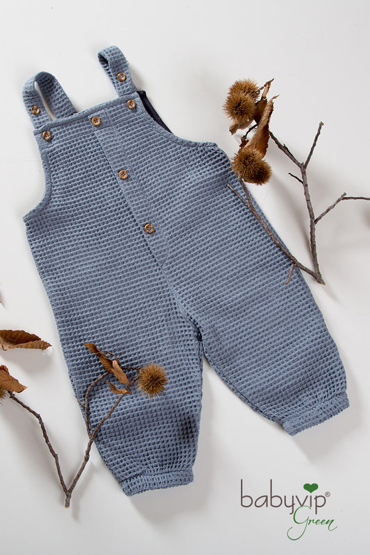 Salopette in cotone organico a nido d’ape con bottoncini in contrasto ed elastico sul fondo
