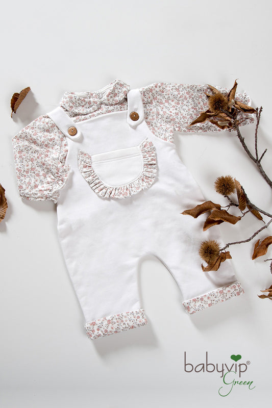 Completo 2 pezzi : Blusa in cotone fantasia floreale + Salopette in felpa garzata con tasca in cotone organico