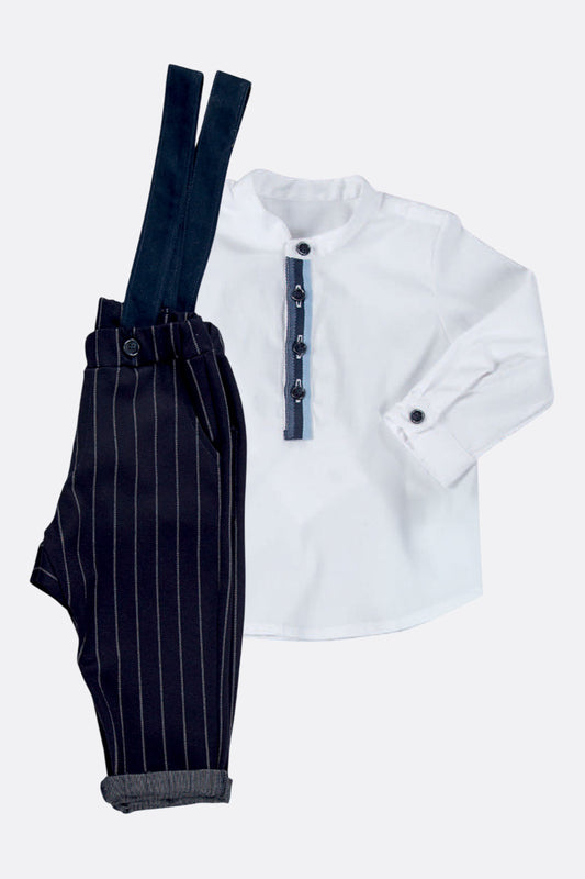 Completo 2 pezzi: Camicia in tela di cotone e Pantalone con bretelle in tessuto gessato modello con cavallo sceso e tasche