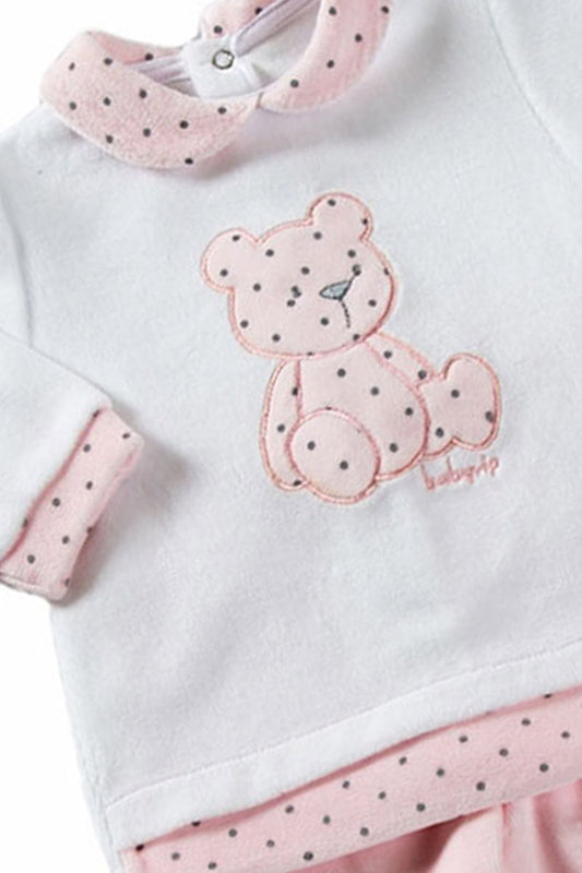 Completo 2 pezzi in ciniglia in ciniglia con inserti a pois e ricamo