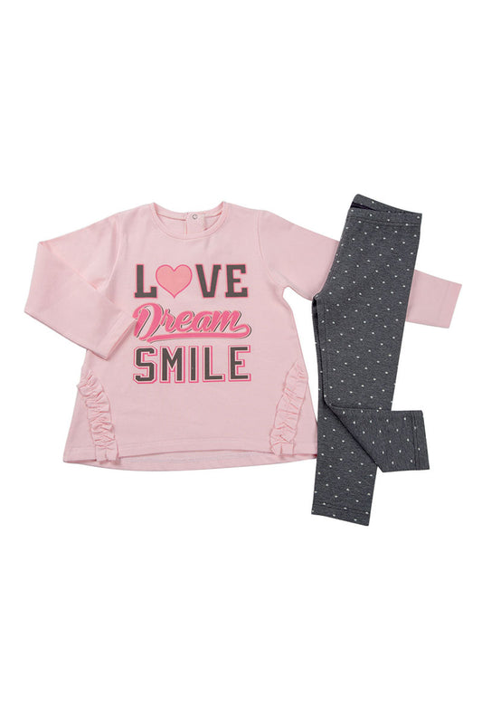 Completo 2 pezzi: T-shirt in cotone elasticizzato garzato con stampa - leggings fantasia cuoricini