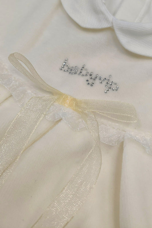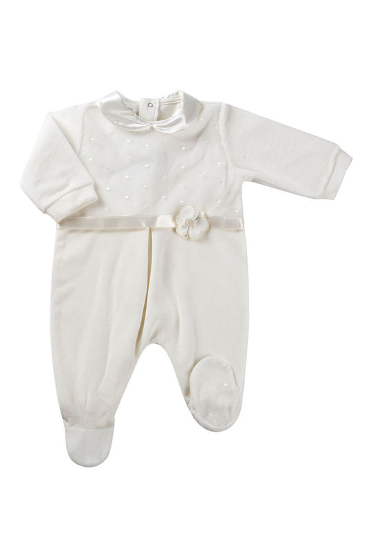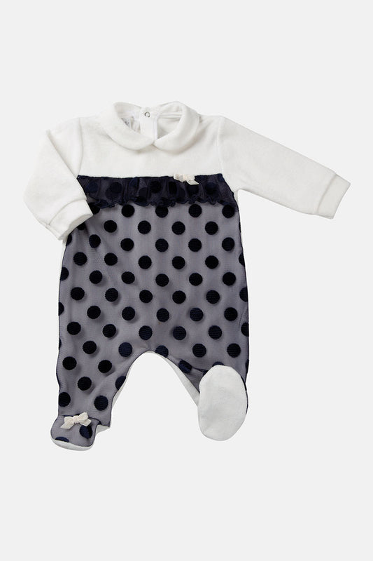 Tutina in ciniglia con inserto in tulle ricamato a pois - colletto e nastro in raso e fiocco