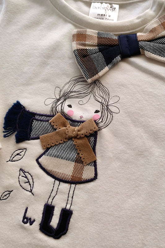 Maglia in cotone elasticizzato garzato con stampa e ricamo con fiocco applicato