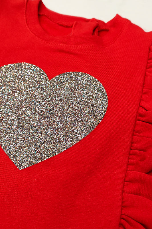 Maglia in felpa garzata con stampa cuore effetto glitter e balze