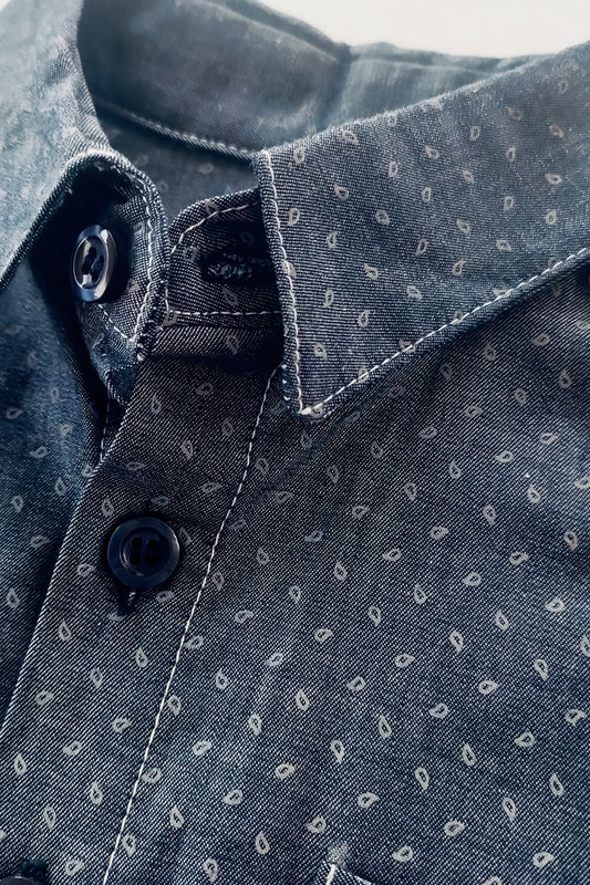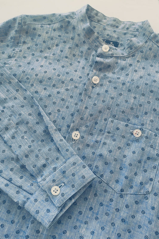 Camicia manica lunga in cotone lino con microfantasia e collo coreana