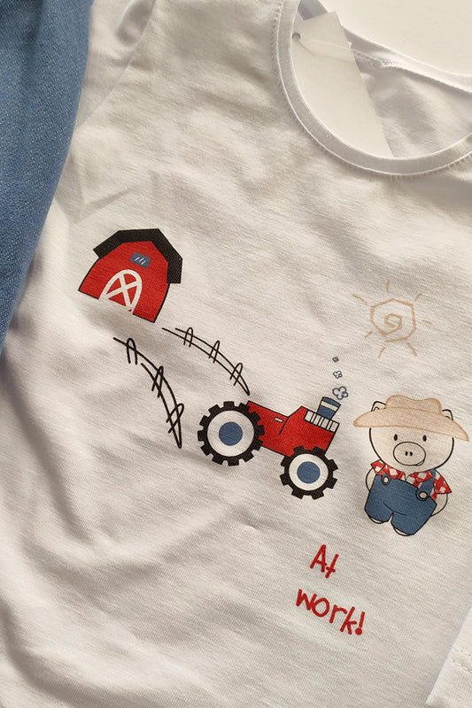 Completo: Maglia manica lunga in cotone elasticizzato con stampa e Pantalone in tessuto effetto jeans elasticizzato modello cavallo basso con tasche, tagli e profili in contrasto