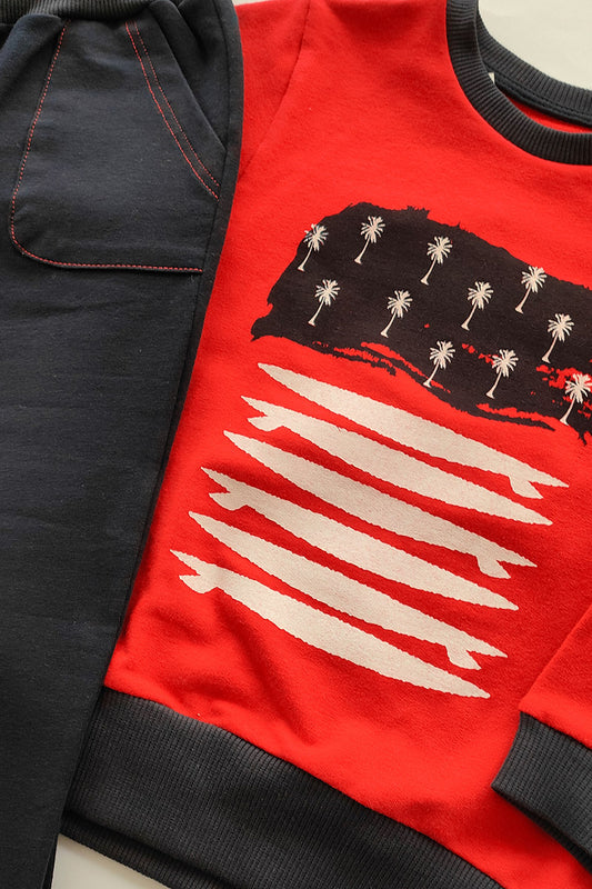 Completo in felpina con stampa, bordi e pantalone in contrasto con tasche