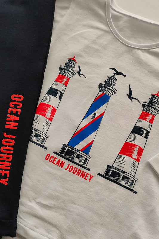 Completo: T-shirt manica lunga in cotone elasticizzato con stampa e pantalone in felpina con stampa sul fondo e risvolti