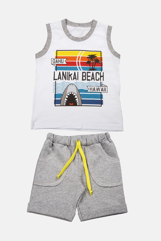 Completo canotta in cotone elasticizzato con stampa e pantaloncino in felpina con risvolti e coulisse in contrasto
