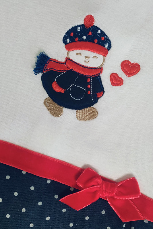 Tutina in caldo cotone fantasia pois con applicazione ricamata e fiocchi
