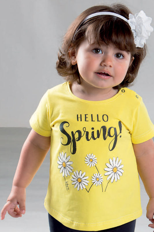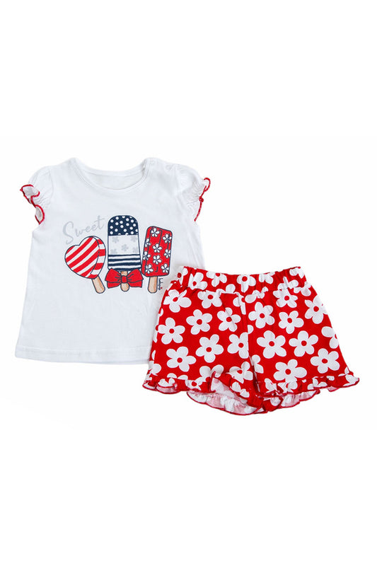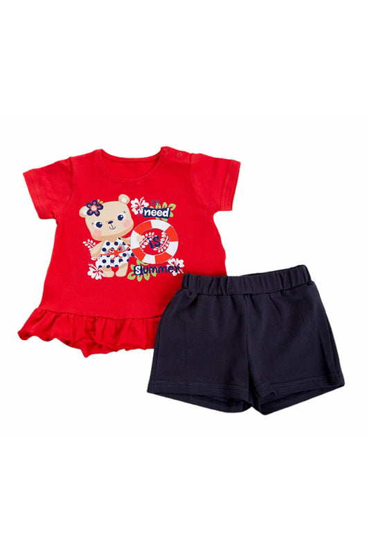 Completo 2 pezzi t-shirt mezza manica in cotone elasticizzato con stampa e balza + pantaloncino in contrasto