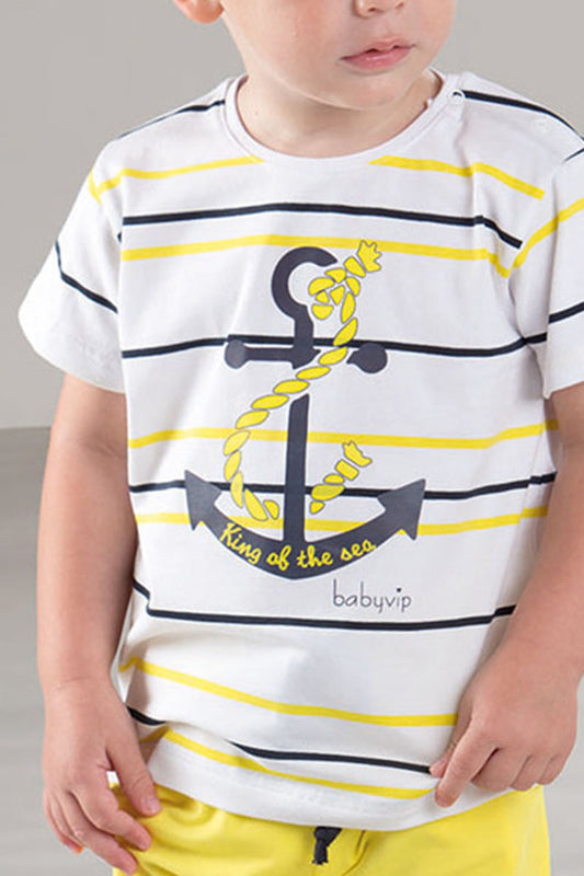 Completo in cotone cotone rigato con stampa e pantaloncino in contrasto con tasche e risvolti