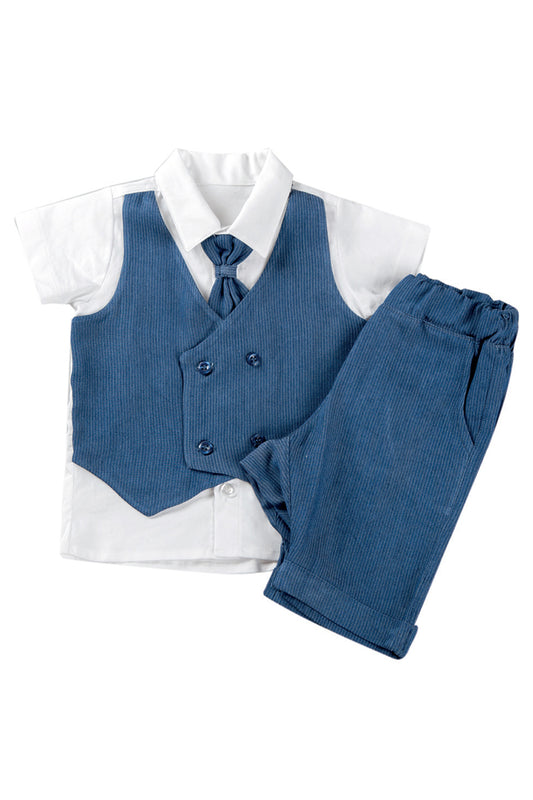 Completo 3 PezziI : Body a camicia in tela di cotone con cravattino staccabile + gilet doppio petto incorporato in tessuto gessato + bermuda con tasche e risvolti