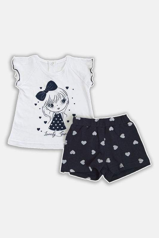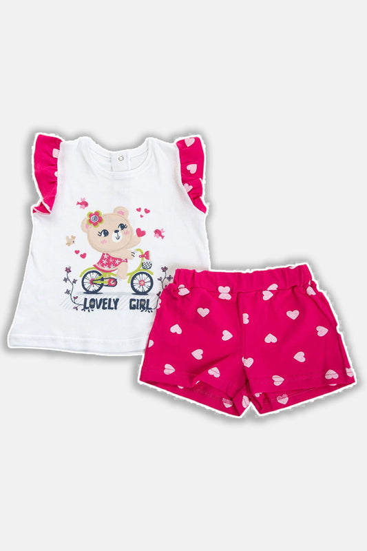Completo 2 pezzi in cotone con maniche ad aletta, stampa e pantaloncino in cotone elasticizzato fantasia cuori