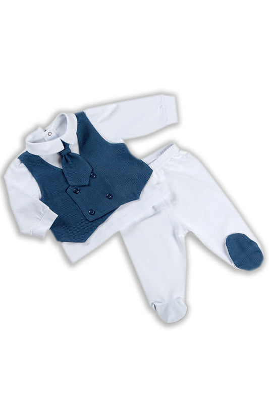 Completo 3 Pezzi: Body a camicia m/l in tela di cotone con cravattino staccabile + gilet doppio petto in tessuto gessato + pantalone con tasche e risvolti