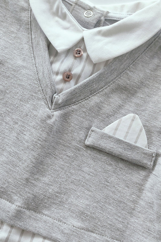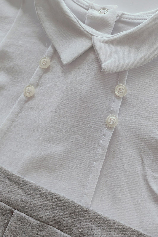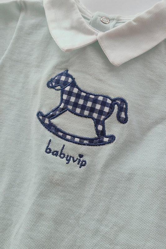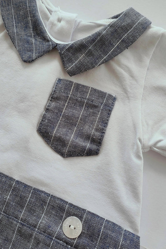 Pagliaccetto mezza manica in cotone elasticizzato con inserti in tela rigata e ricamo babyvip