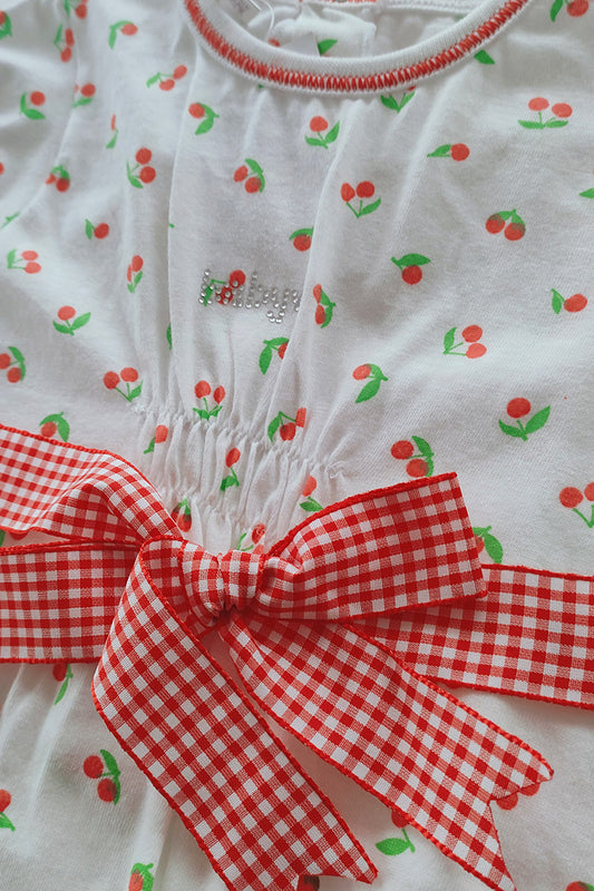 Pagliaccetto mezza manica in cotone con stampa ciliegie e fiocco fantasia vichy