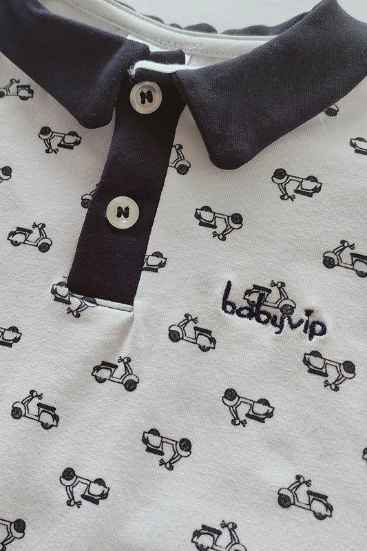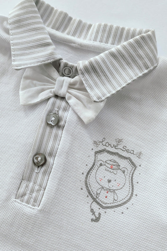 Pagliaccetto mezza manica in piquet con inserti in piquet a navetta rigato, papillon e stampa