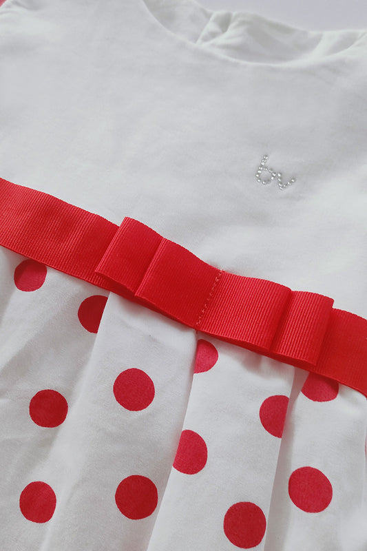 Pagliaccetto mezza manica in cotone fantasia pois con nastro in gros grain e stras