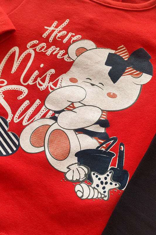 Completo: T-shirt in cotone elasticizzato con stampa + pantalone in maglina a pois con fiocco