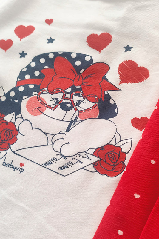 Completo manica lunga in cotone elasticizzato con stampa, rouches sul fondo e leggings in contrasto con fantasia cuori