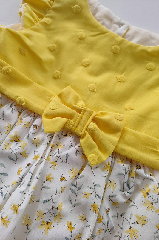 Vestitino in tela di cotone fantasia floreale e inserto in tessuto operato a pois con fiocco e mutandina abbinata