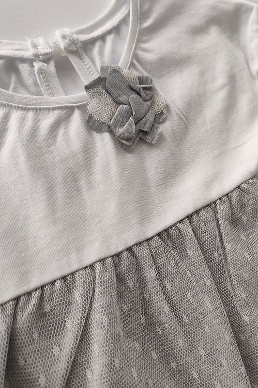 Vestitino in cotone elasticizzato con inserti in tulle a pois e rosellina + mutandina in cotone elasticizzato