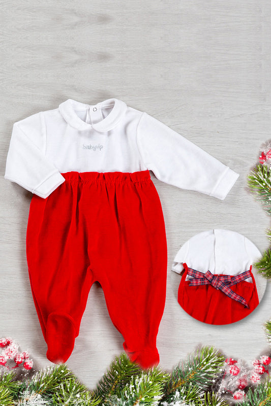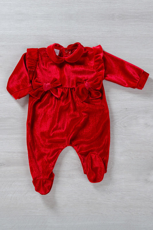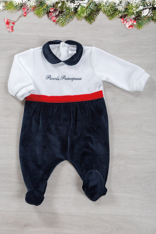 Tutina neonata in ciniglia con ricamo "Piccola Principessa" e nastro in velluto rosso