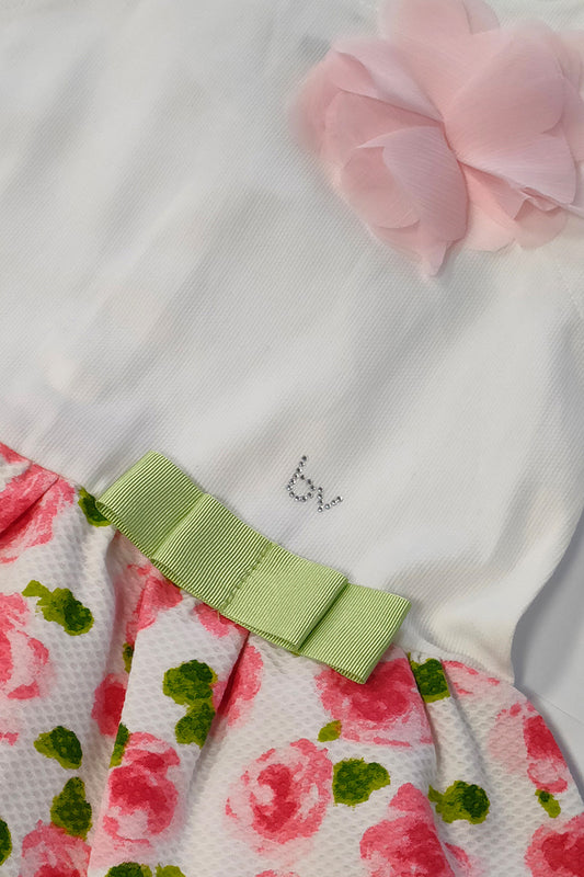 Vestitino in tessuto operato fantasia floreale con nastro in raso e strass