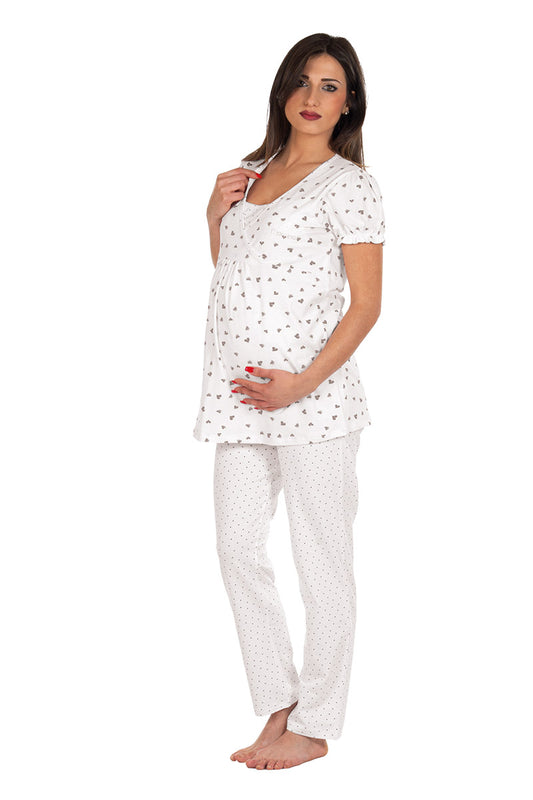 Pigiama pre-post parto mezza manica in cotone elasticizzato con stampa pois cuoricini e taglio incrociato