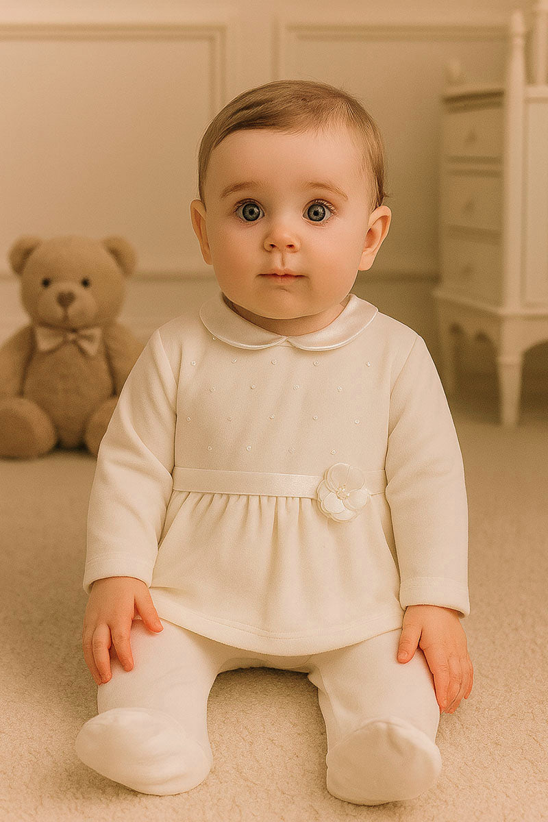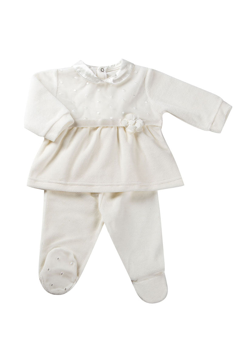 Completo 2 pezzi in ciniglia con inserto in tulle ricamato a pois - colletto e nastro in raso e fiocco