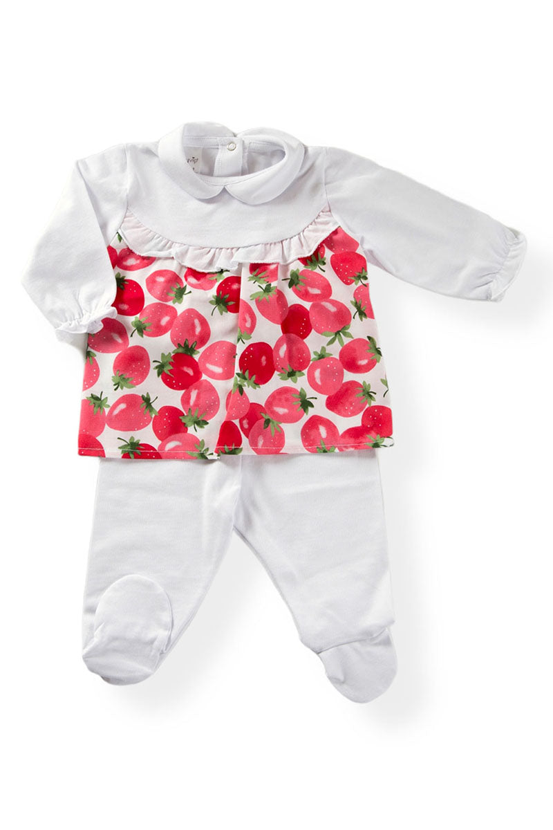Completo 2 pezzi in cotone elasticizzato con taglio carrè - balza ed inserto in tela di cotone organico fantasia fragole