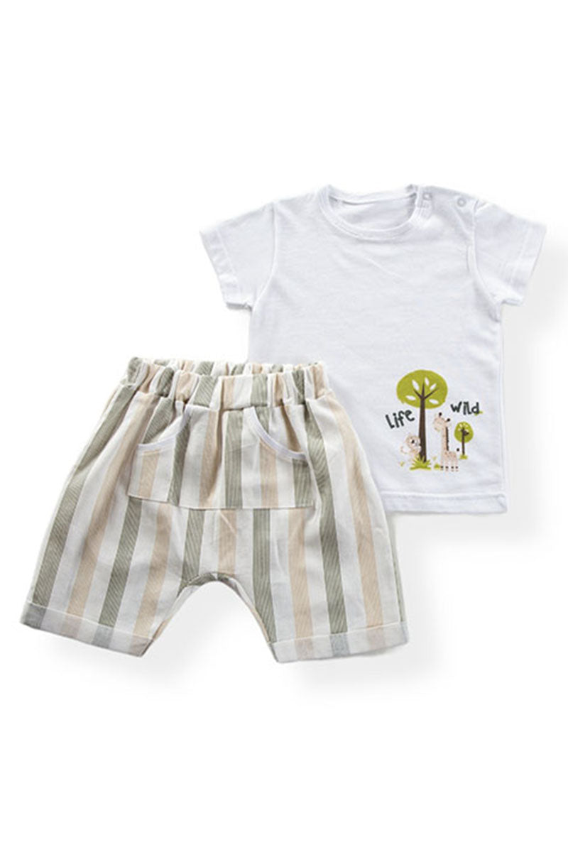 Completo 2 pezzi : Maglia in cotone con stampa + Bermuda in tessuto effetto lino rigato modello cavallo basso con tascone