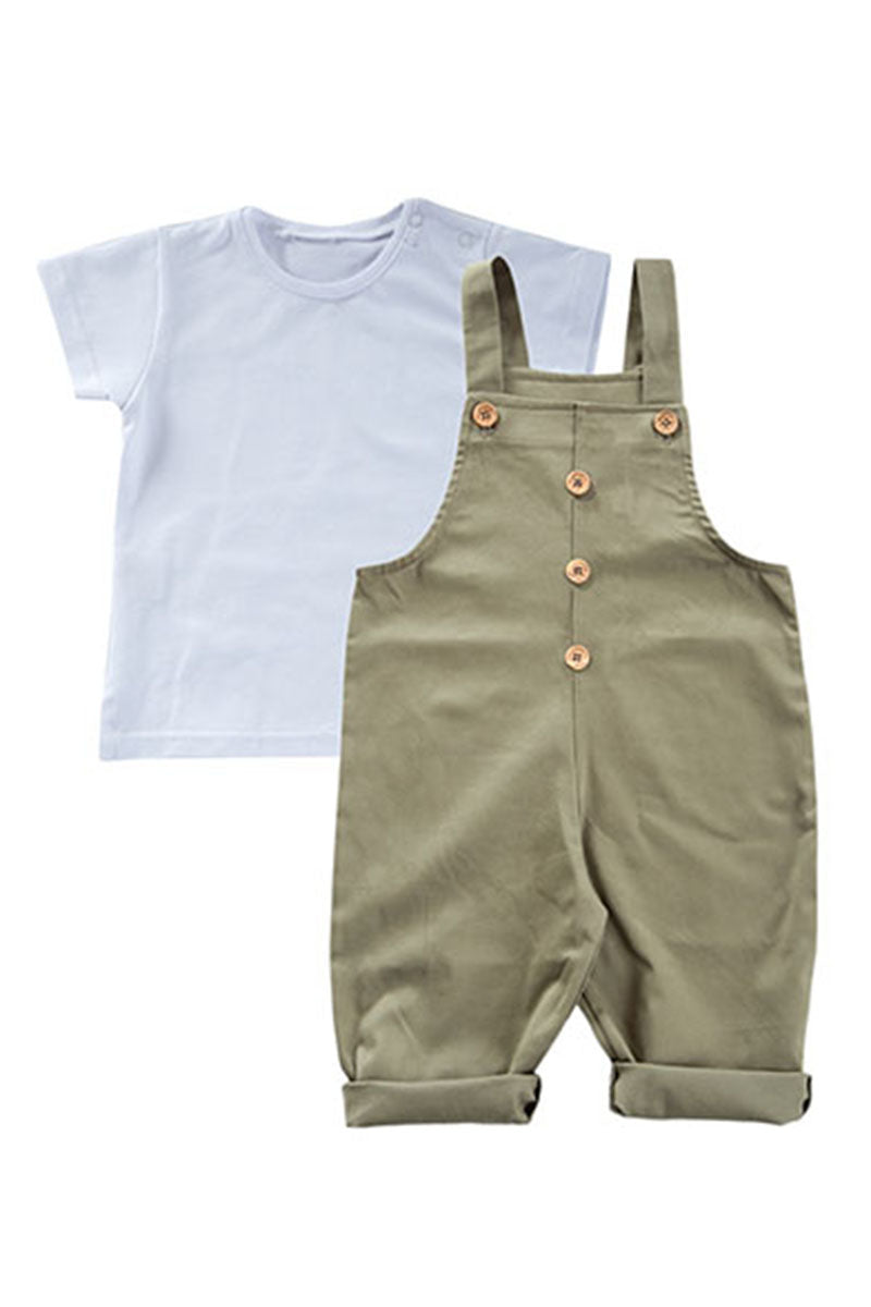 Completo 2 pezzi: Maglia in cotone con Salopette in tessuto e bottoni effetto legno