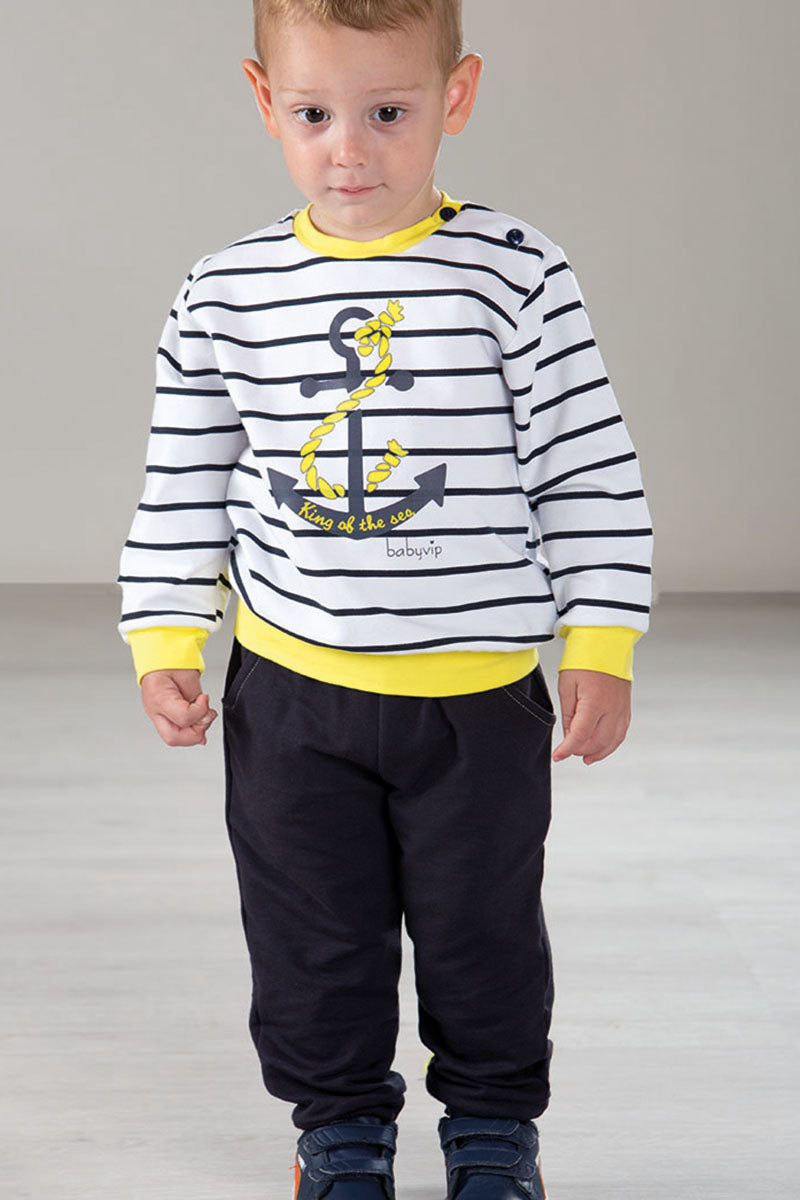 Completo in felpina rigata con stampa bordi in contrasto e pantalone con tasche e polsi sul fondo