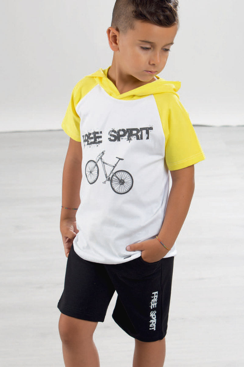 Completo: T-shirt in cotone elasticizzato con cappuccio e stampa + Bermuda in felpina con tasche e stampa
