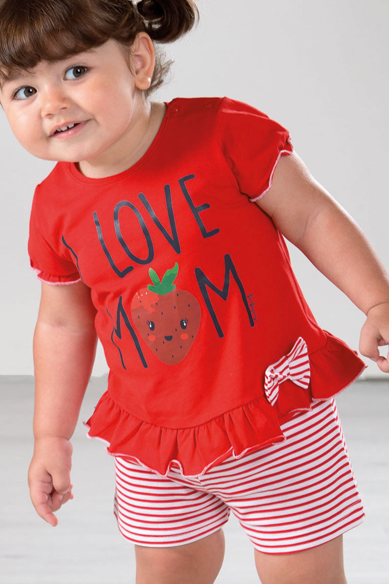 Completo mezza manica in cotone con stampa balza fiocco e short rigato