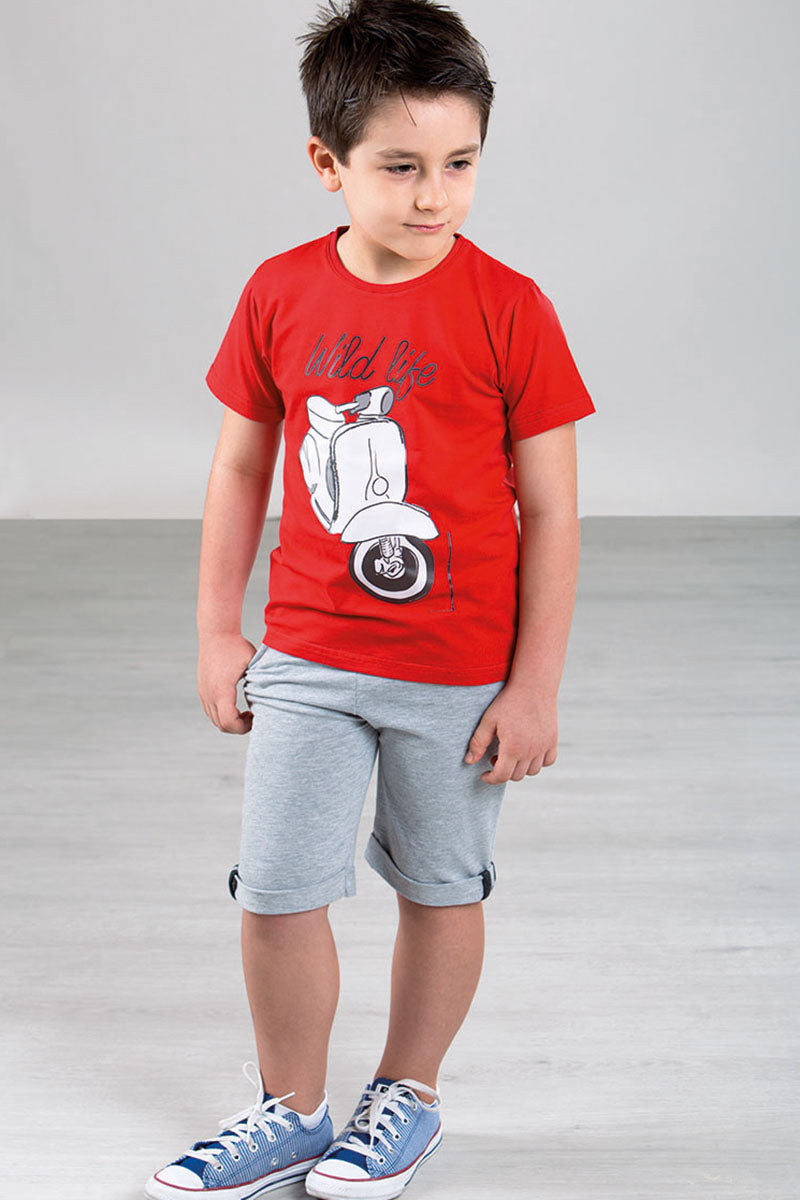 Completo mezza manica in cotone elasticizzato con stampa e pantaloncino in felpina fantasia stelle con risvolti e tasche