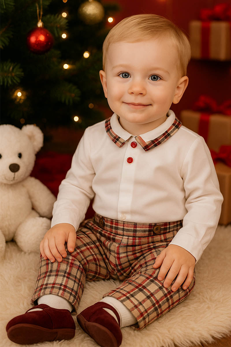 Body a camicia in cotone con colletto, profilo in tessuto scozzese e bottoncini