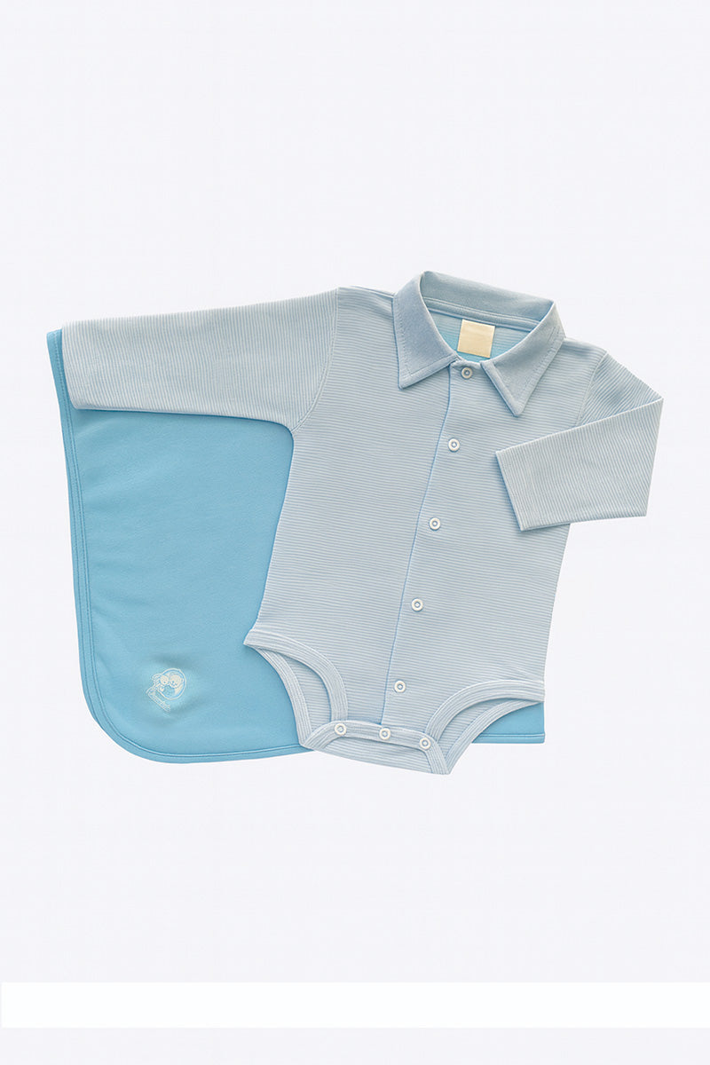 Pacchetto nascita 2 pezzi con body rigato con colletto e copertina in cotone con stampa