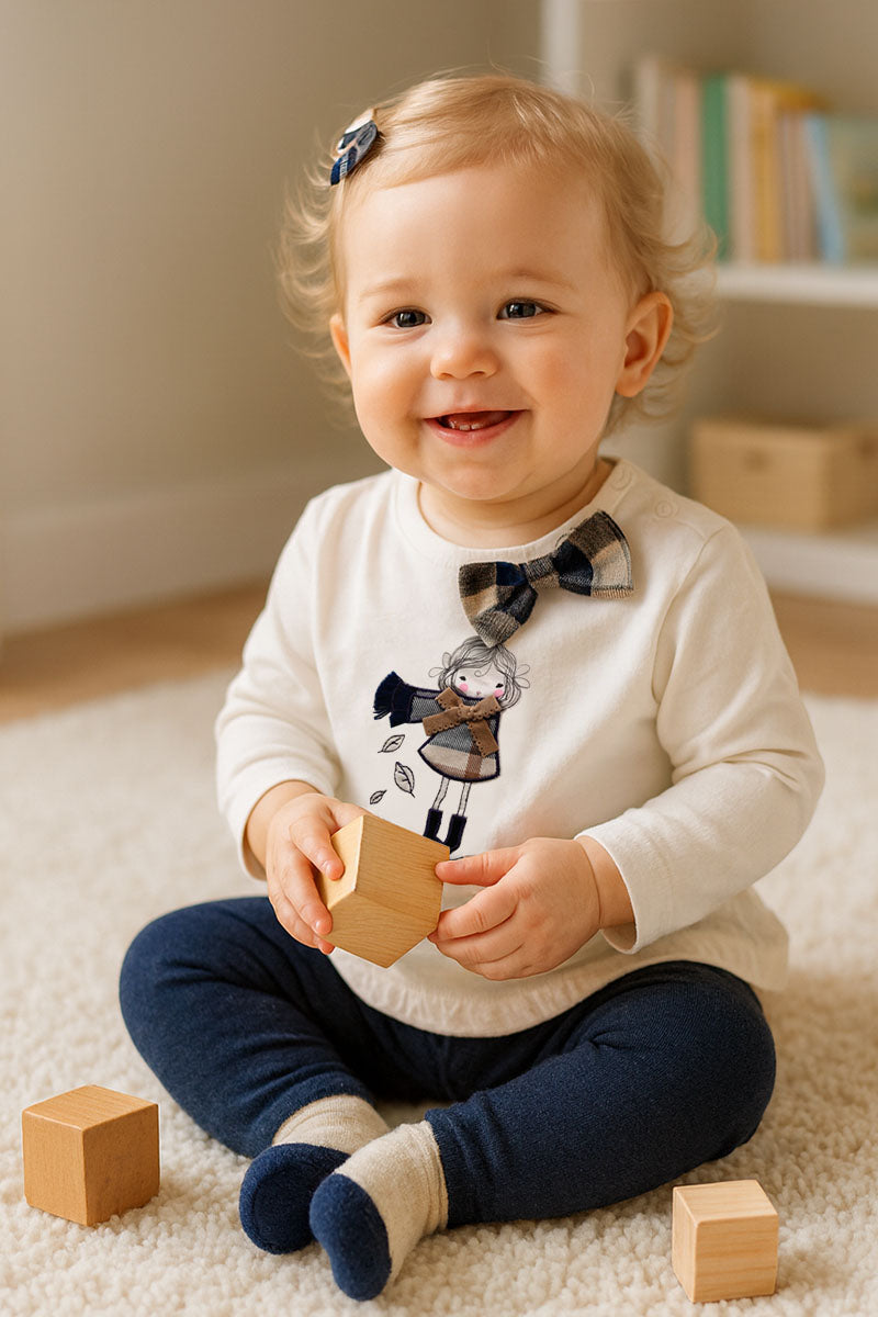 Maglia in cotone elasticizzato garzato con stampa e ricamo con fiocco applicato