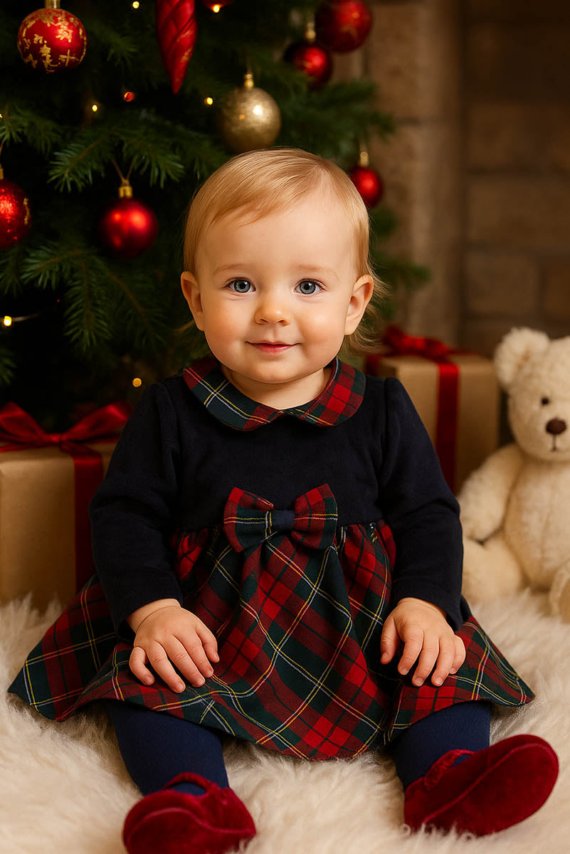 Vestitino in ciniglia con colletto in flanella scozzese + fiocco applicato e gonna arriciata