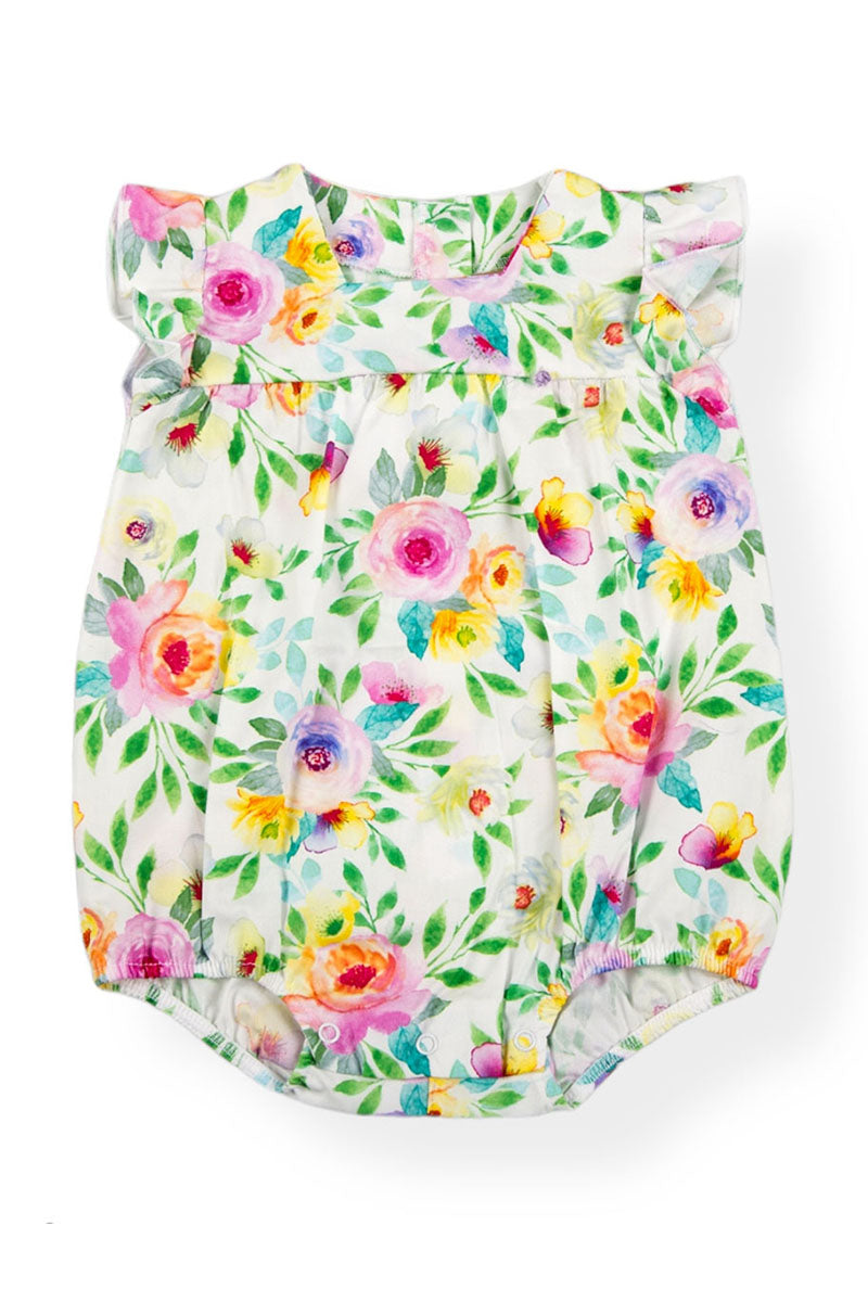 Pagliaccetto in tela di cotone organico fantasia floreale con scollo quadro alette e taglio con arricciatura