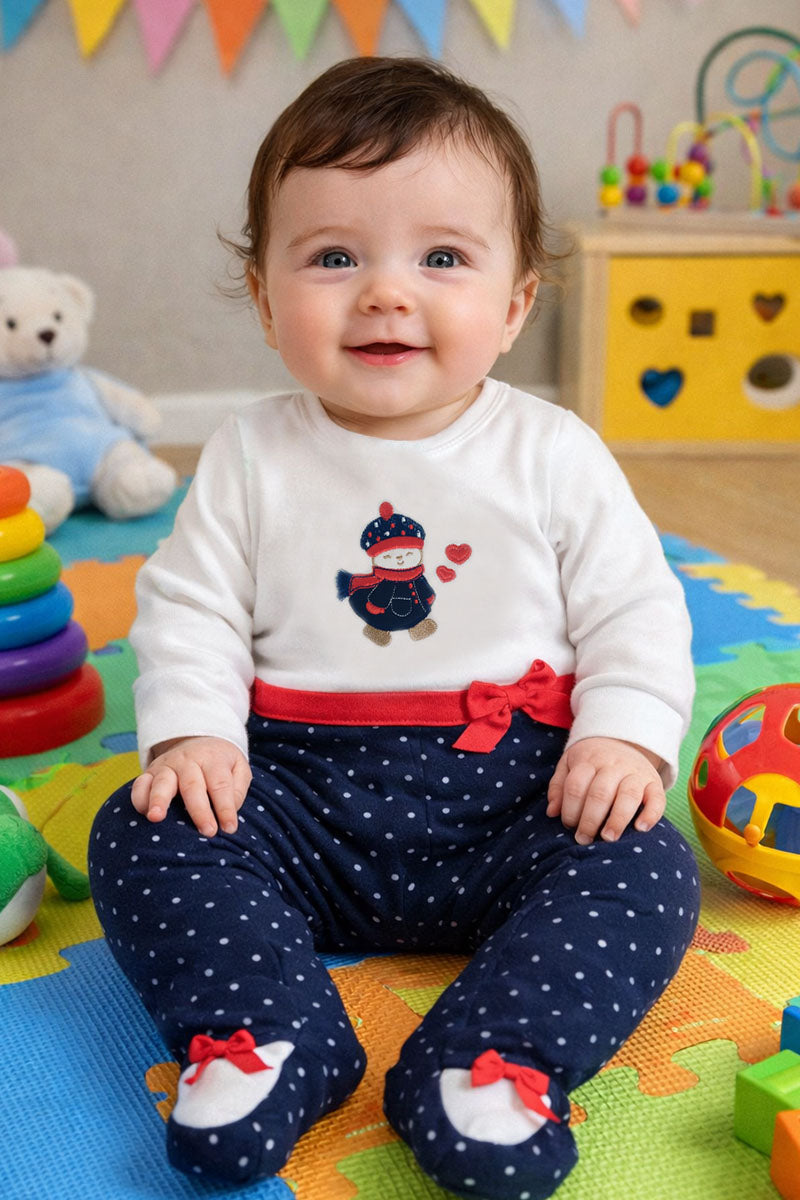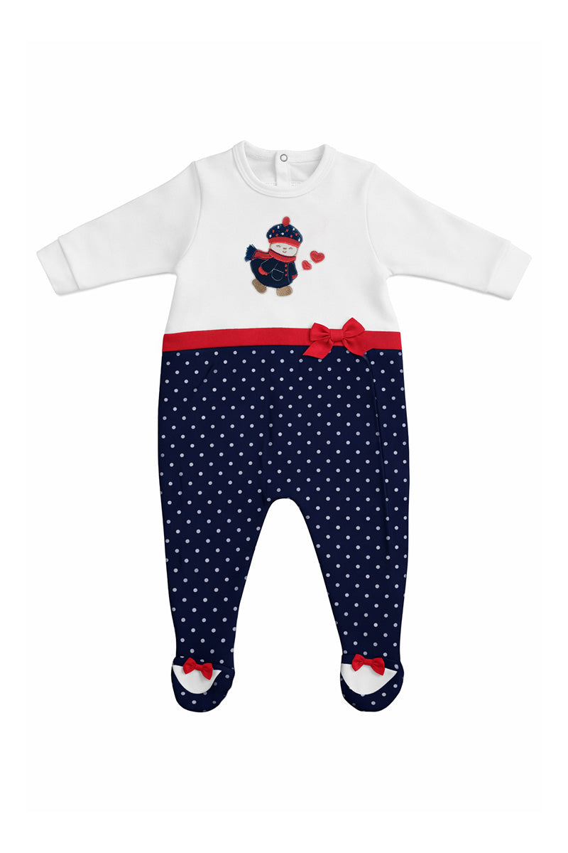 Tutina in caldo cotone fantasia pois con applicazione ricamata e fiocchi