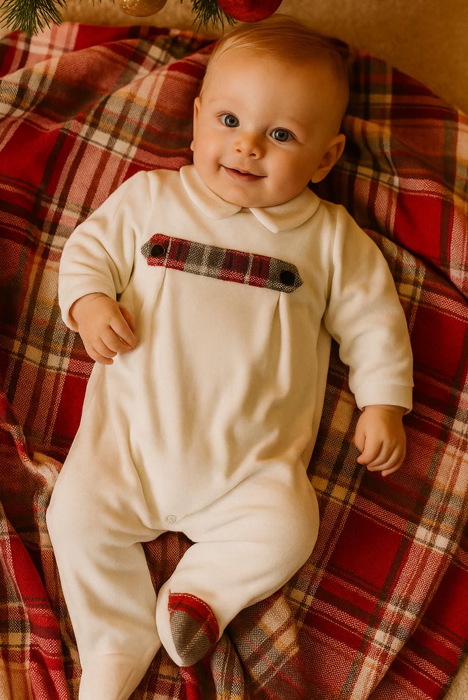 Tutina in ciniglia con pattina applicata in tessuto scozzese
