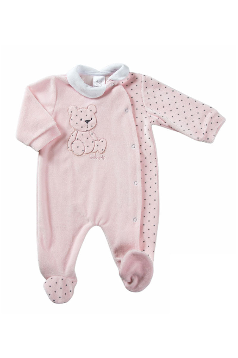 Tutina in ciniglia con apertura anteriore laterale e inserti a pois con ricamo