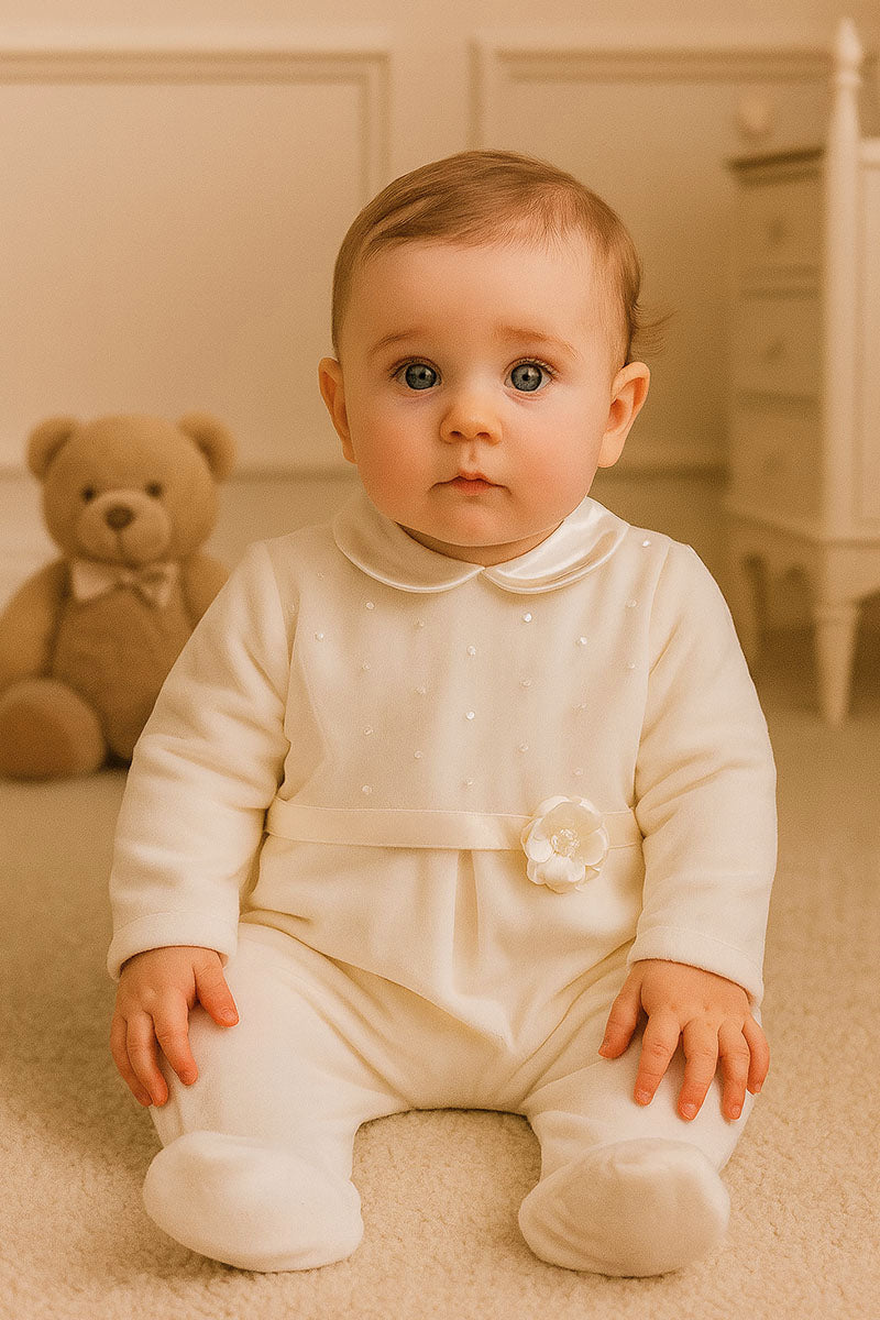 Tutina in ciniglia con inserto in tulle ricamato a pois - colletto e nastro in raso e fiocco