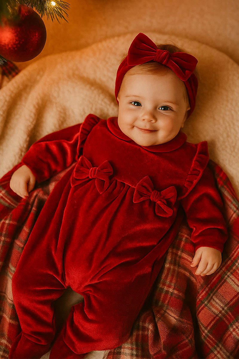 Tutina in velluto con alette arricciate, taglio con arricciatura e fiocchi in tessuto applicati