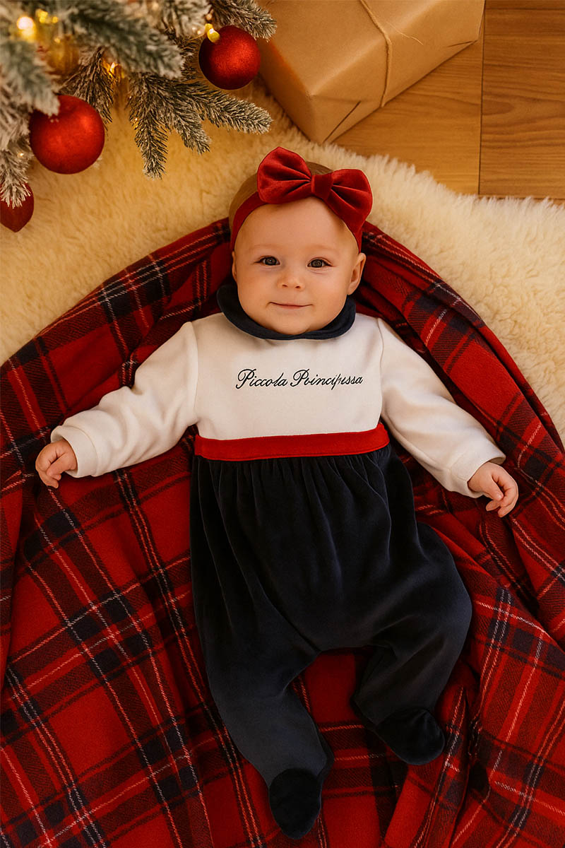 Tutina neonata in ciniglia con ricamo "Piccola Principessa" e nastro in velluto rosso